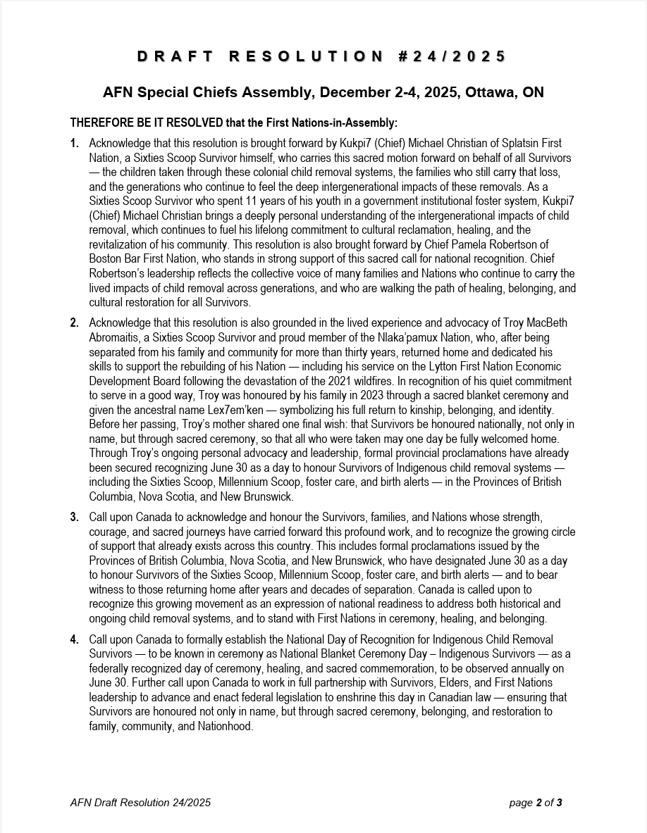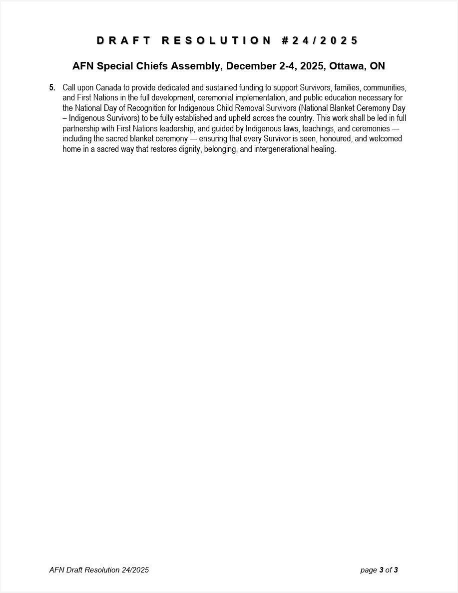 Resolution Supporting Survivors A key moment at the Assembly was the passage of a resolution calling on the Government of Canada to formally recognize Indigenous Child Removal Survivors, including Sixties Scoop Survivors. The resolution supports for the establishment of National Blanket Ceremony Day – Indigenous Survivors, to be observed annually on June 30.